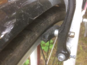 Your brake pads should clamp onto the rim when applied and not the tyre. If need be, you can adjust the alignment of the brake pads using an Allen key.